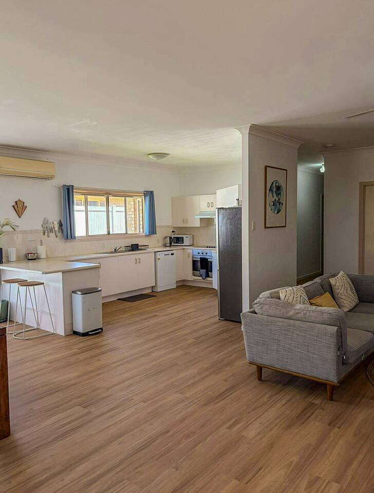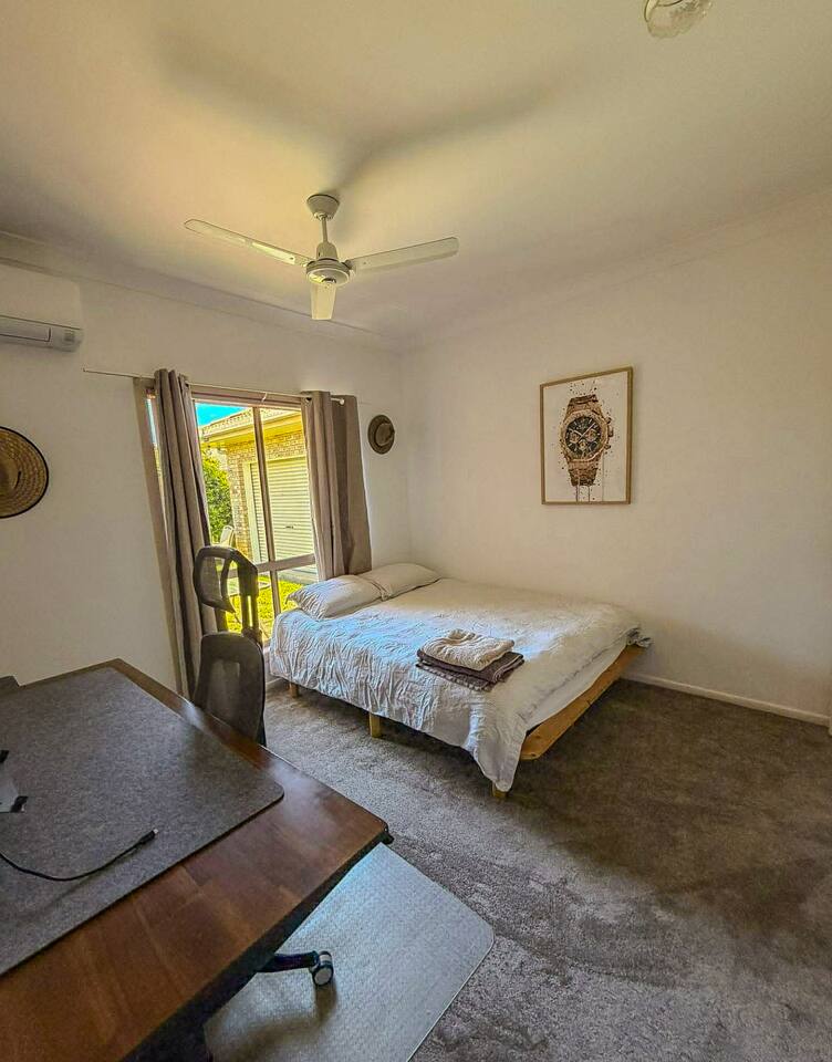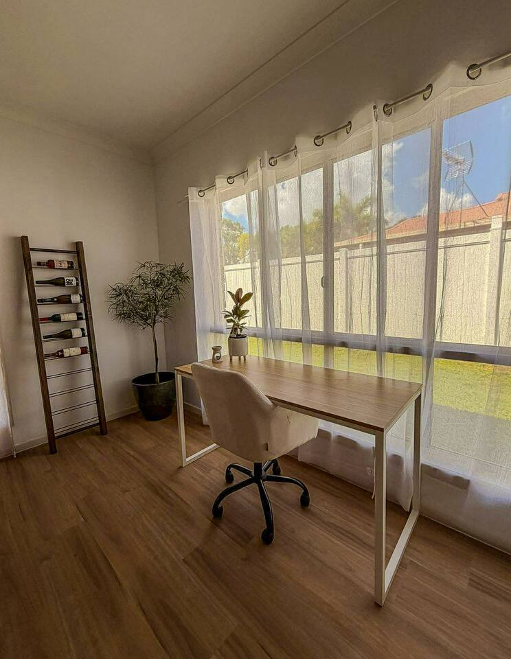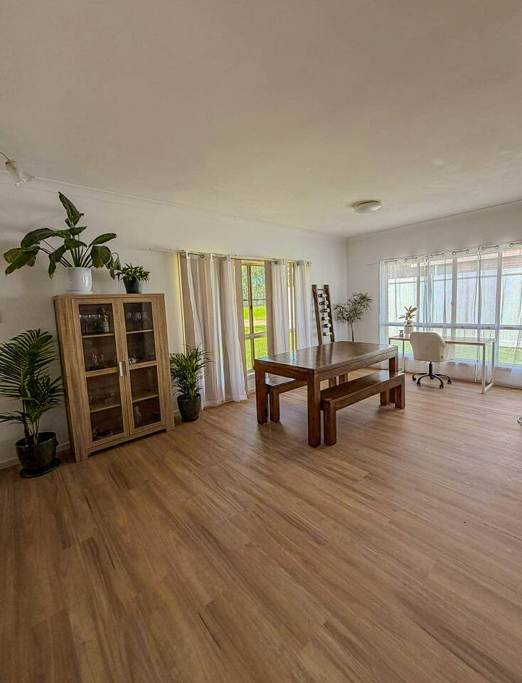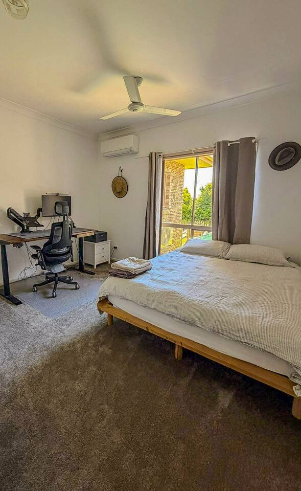 5 bedroom house with ample parking and good lawns for the kids to run around. 2 bedrooms are set up with work from home stations. 3 bedrooms and the main living space have aircon, all bedrooms have ceiling fans. Main bedroom has an ensuite, other rooms share a split shower/bath and seperate toilet. Pet Friendly