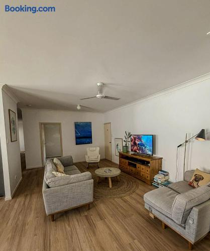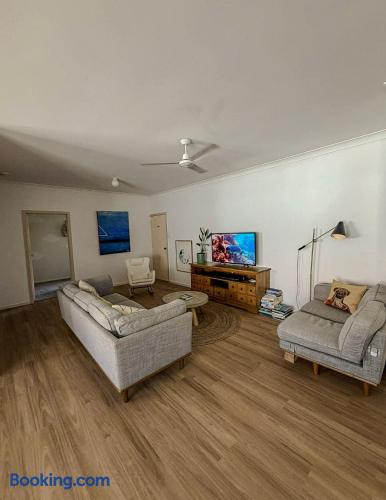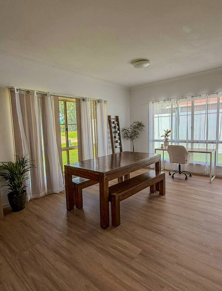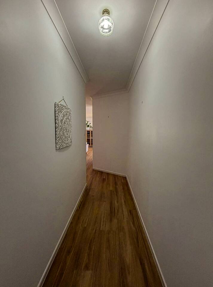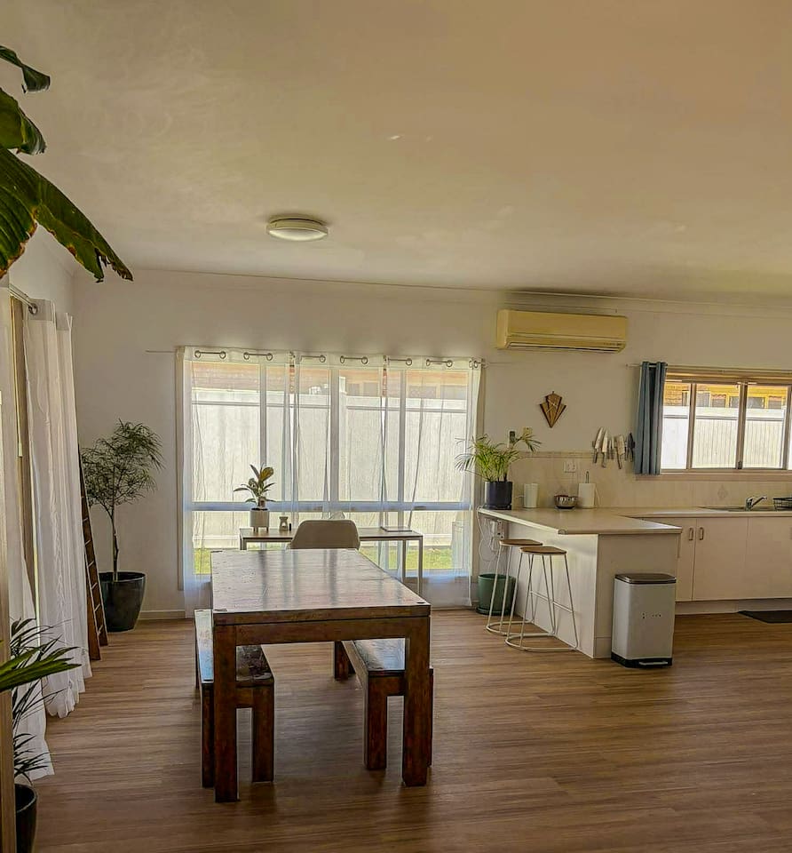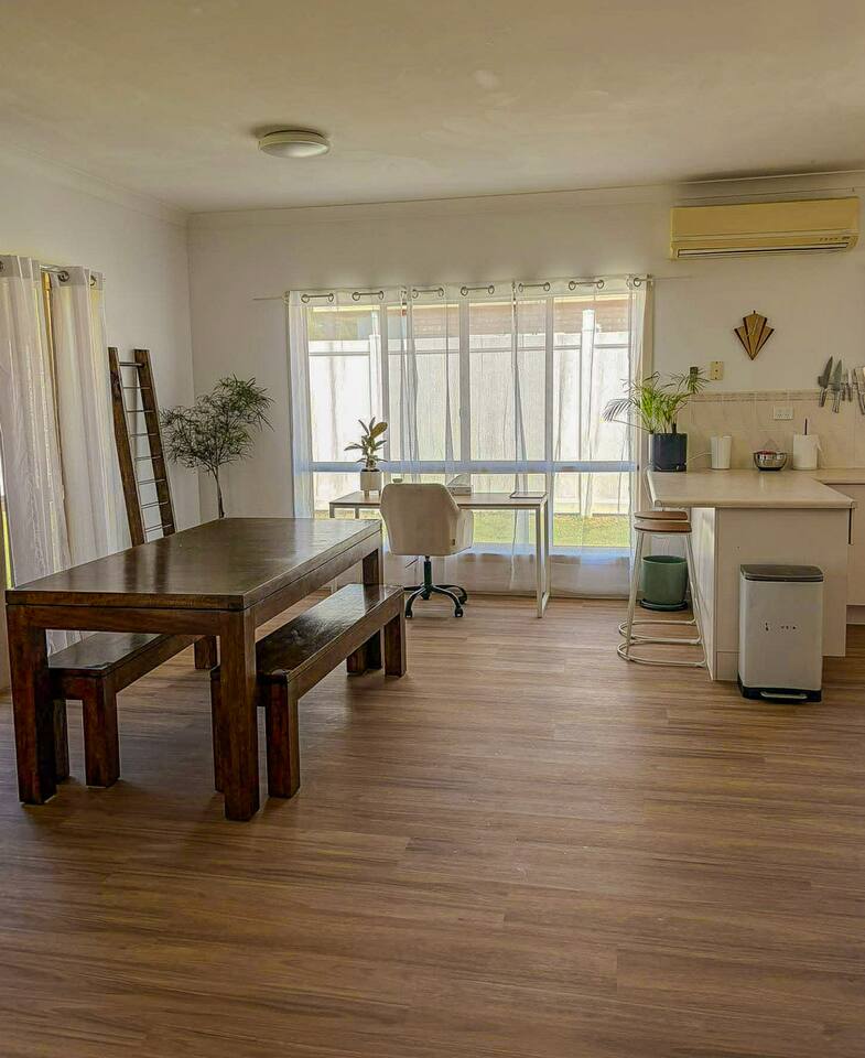 5 bedroom house with ample parking and good lawns for the kids to run around. 2 bedrooms are set up with work from home stations. 3 bedrooms and the main living space have aircon, all bedrooms have ceiling fans. Main bedroom has an ensuite, other rooms share a split shower/bath and seperate toilet. Pet Friendly