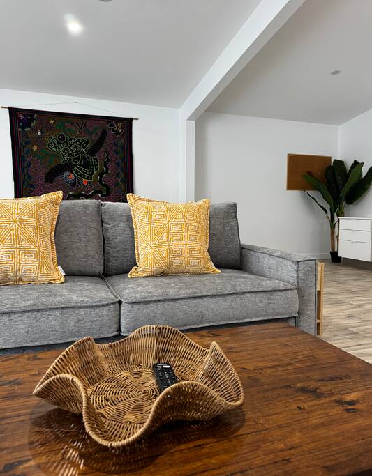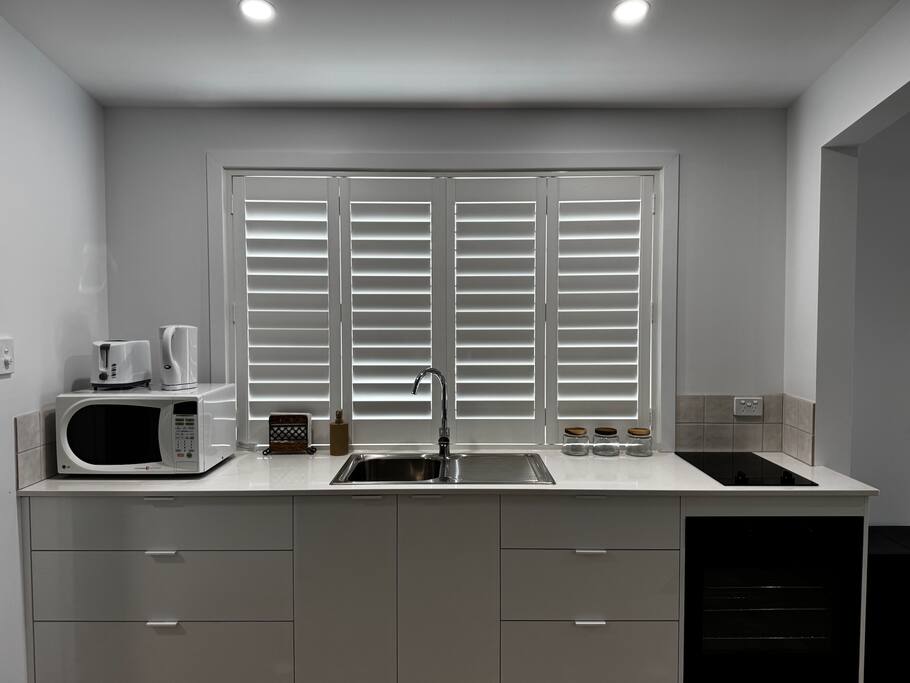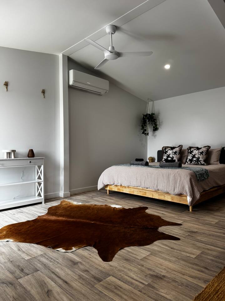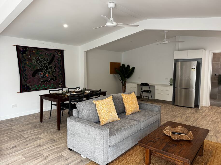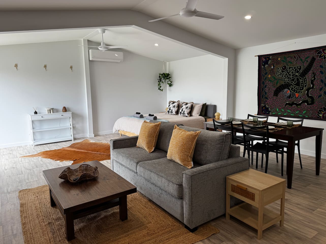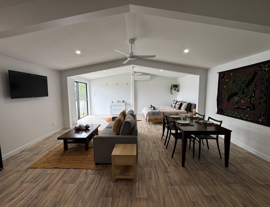 Perfect for couples, families, friends or work travellers, this studio comfortably sleeps up to 4 guests, with the option to accommodate a 5th guest by prior arrangement. 🛏 Sleeping Arrangements Luxurious king bed Queen-size sofa bed that easily folds out Optional extra mattress or trundle bed for one additional guest (on request) ❄ Comfort & Entertainment Air-conditioning plus three ceiling fans Large wall-mounted smart TV with Netflix Ideal setup for movie nights or little gamers Free, reliable Wi-Fi Office desk and drawers for work or study 🍳 Kitchenette Microwave Stovetop & oven Dining table for meals or work 🚿 Bathroom & Laundry Fully renovated, sleek bathroom with shower, toilet & vanity Laundry located out the back with washing machine & dryer 🌿 Location & Privacy Set in a quiet cul-de-sac, surrounded by acreage blocks No close neighbours — peaceful and private Owner’s home is nearby but guests are not disturbed and assistance is only provided if requested 📍 Location Highlights Just minutes from Yeppoon Main Street Easy access to Byfield, Five Rocks and surrounding adventure destinations Perfect base for coastal exploration, hiking, and weekend getaways Whether you’re here to relax, explore, work remotely or enjoy the coast — this stylish studio offers everything you need for a comfortable stay.